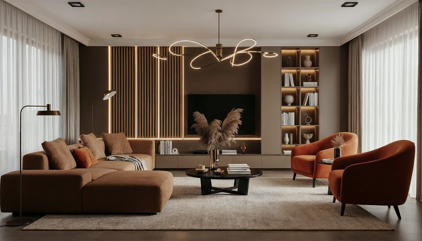 A moody, masculine interior combining deep tones, minimalist design, and refined finishes.